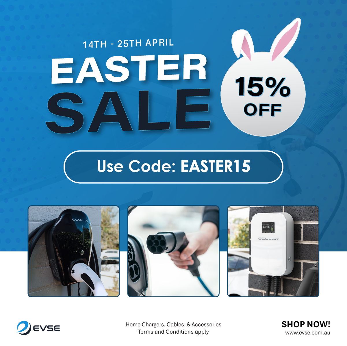 From 14th to 25th April 2025 inclusive, use the code EASTER15 at checkout to receive 15% off evse.com.au online purchases of home charging products. Excludes warranties, gift cards, bundles, installation and agency brands such as Tesla, Zappi and Fronius. Not available for commercial quotes as this is an ecommerce sale for priced items. Not available with any other offer. Shipping options are available via the website. For more information, contact [email protected] or call 1300 406 210.