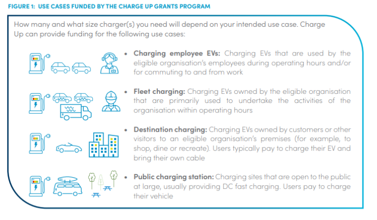 Round 3 of the Charge Up Grant includes both AC (7kw – 22kW) and DC Chargers (25kW to 350kW), Software & Installation services for small and medium enterprises, non-profits, councils and local governments.